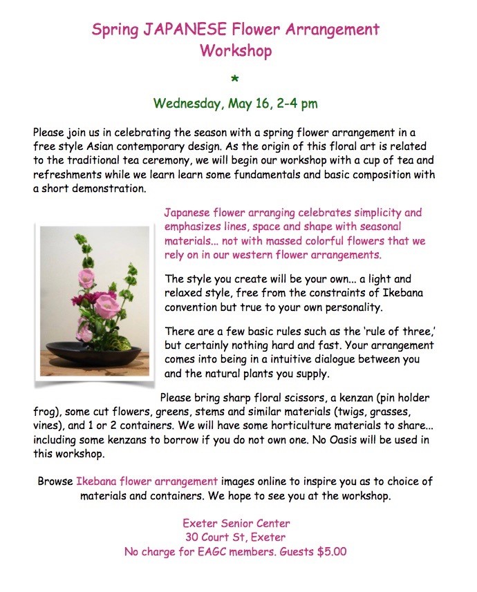 * Our Indoor Yard Sale is less than two weeks away — gather up those un-needed treasures and pack them up for the big day, on April 21. Delivery day is Friday, April 20, from 3 to 6 at the Stratham Municipal Center. Click here for more info or contact Dianna or Carole.