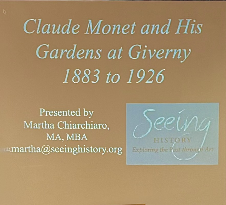 Our March general meeting featured Martha Chiarcharo, who gave a lively and inspiring talk on Claude Monet and His Gardens at Giverny. Everyone came away with a new respect for Monet’s work and the desire to immediately schedule a trip to France to tour the gardens in person.